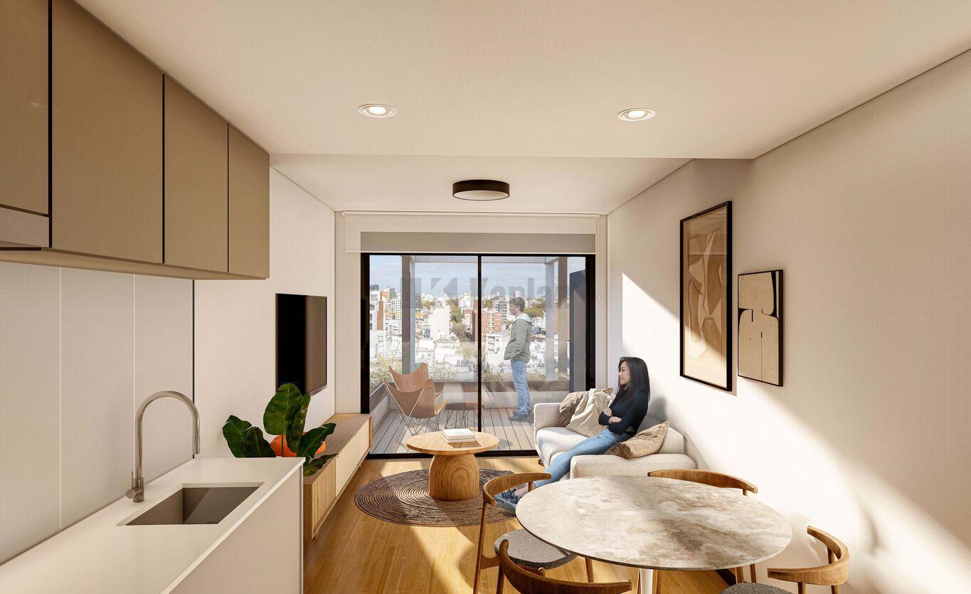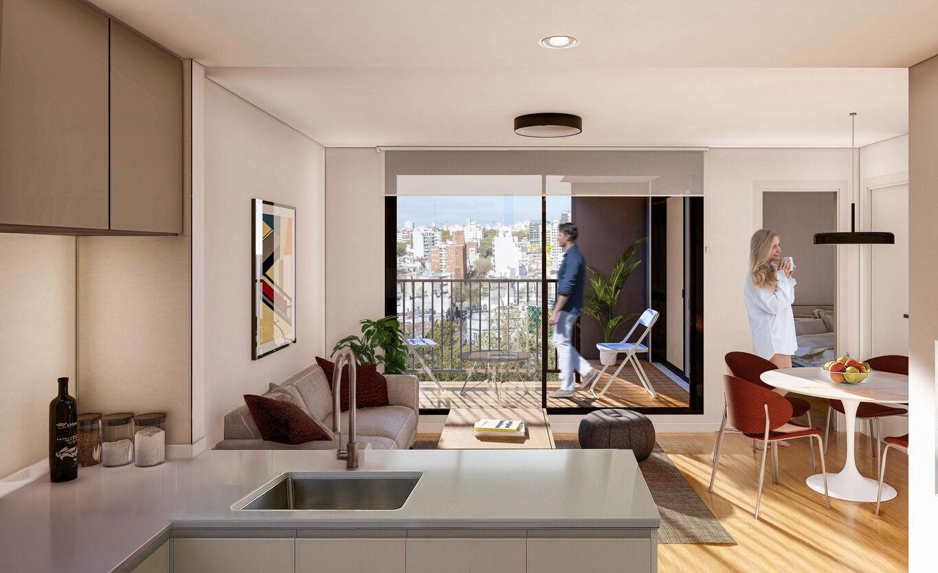 El edificio está compuesto por 38 unidades distribuidas en 11 niveles. Cuenta con 27 apartamentos de 1 dormitorio y 1 PH, y 11 apartamentos de 2 dormitorios y 1 PH. Todas las unidades disponen de patio o terraza de uso exclusivo. En planta baja se ubican los accesos y 10 garajes, incluidos 2 accesibles y 2 dobles.