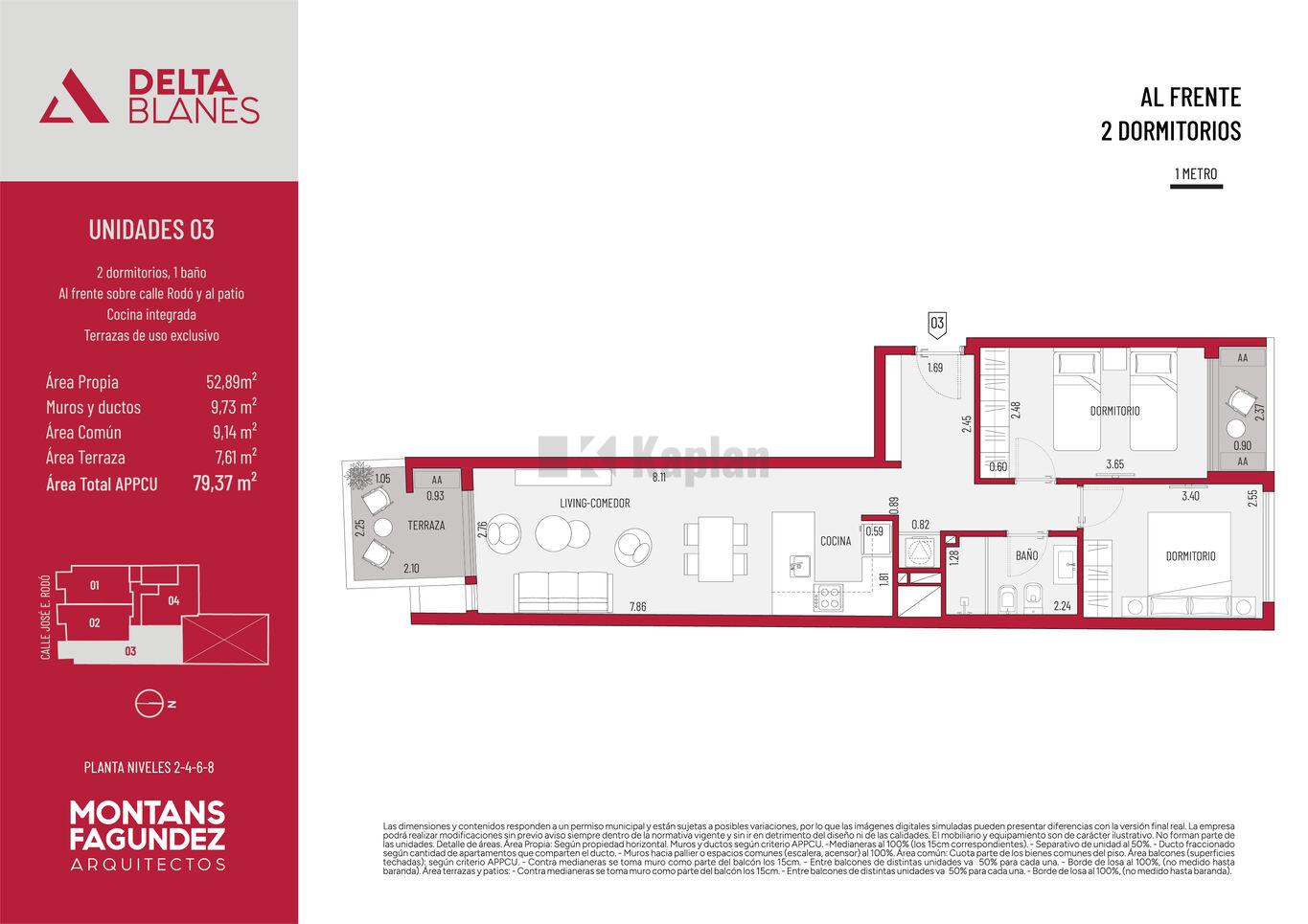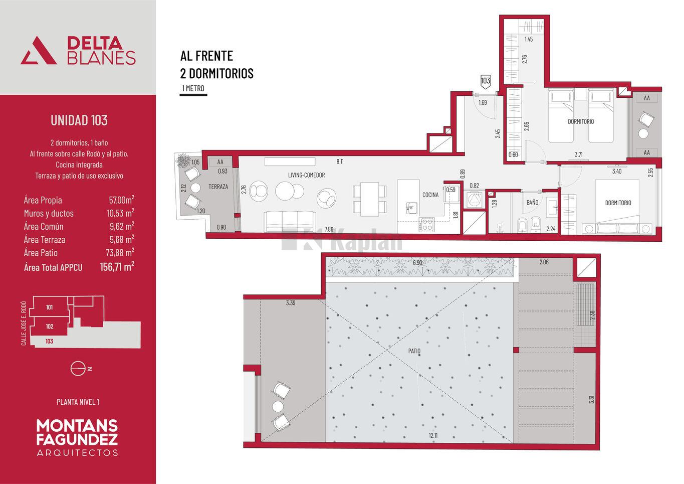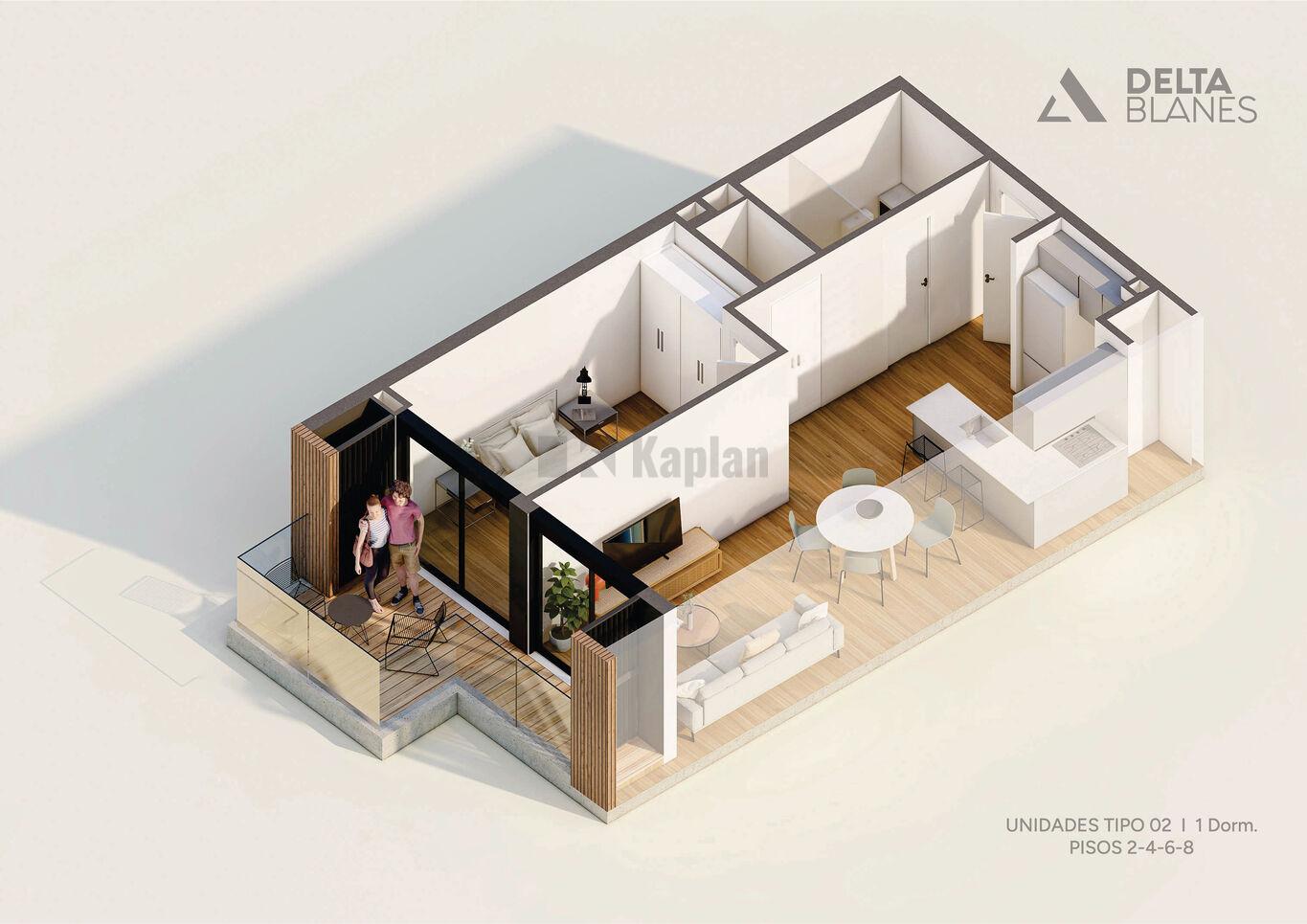 Todas las unidades cuentan con espacios de generosas dimensiones y patios o terrazas de uso exclusivo. El diseño combina materialidad contemporánea con integración de verde en fachada, generando un edificio de identidad única dentro de la línea Delta.
