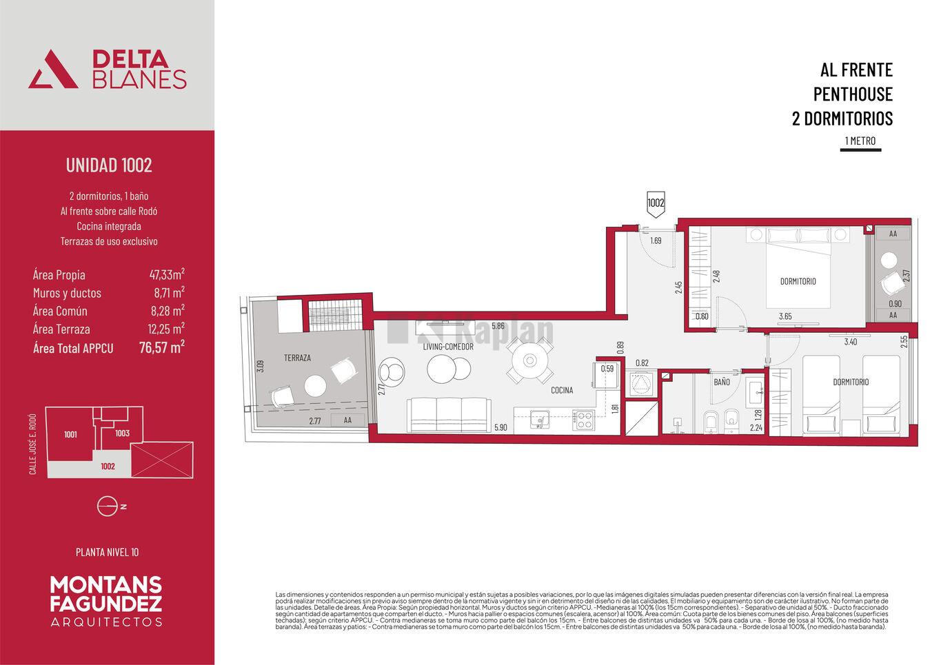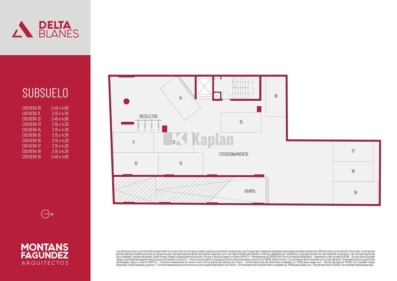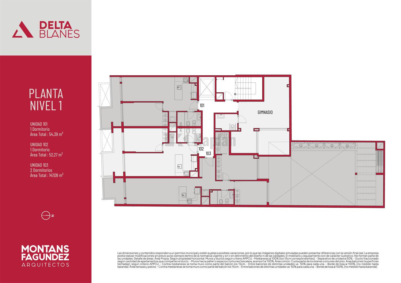 El edificio está compuesto por 38 unidades distribuidas en 11 niveles. Cuenta con 27 apartamentos de 1 dormitorio y 1 PH, y 11 apartamentos de 2 dormitorios y 1 PH. Todas las unidades disponen de patio o terraza de uso exclusivo. En planta baja se ubican los accesos y 10 garajes, incluidos 2 accesibles y 2 dobles.